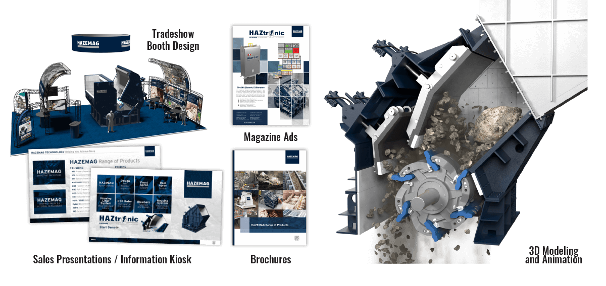 While working with HAZEMAG, a unique need was brought to the table that we have loved offering solutions for. HAZEMAG often gives presentations to aid them when offering multi-million dollar quotes to customers. In order for their clients to get a full understanding of the quote as well as the products being offered, we help HAZEMAG by creating custom computer programs that allow for live simulation of various product scenarios. While HAZEMAG could put together simple presentations using programs they have access to, they were looking for a much more professional look. Rather than putting together an amateur slideshow presentation or spreadsheet, we create high-end presentations that include 3D animation and work to create highly customized sales collateral. Additionally, these presentations are also used at large-scale tradeshows and expos in order to explain and demonstrate Hazemag’s products to potential clients.