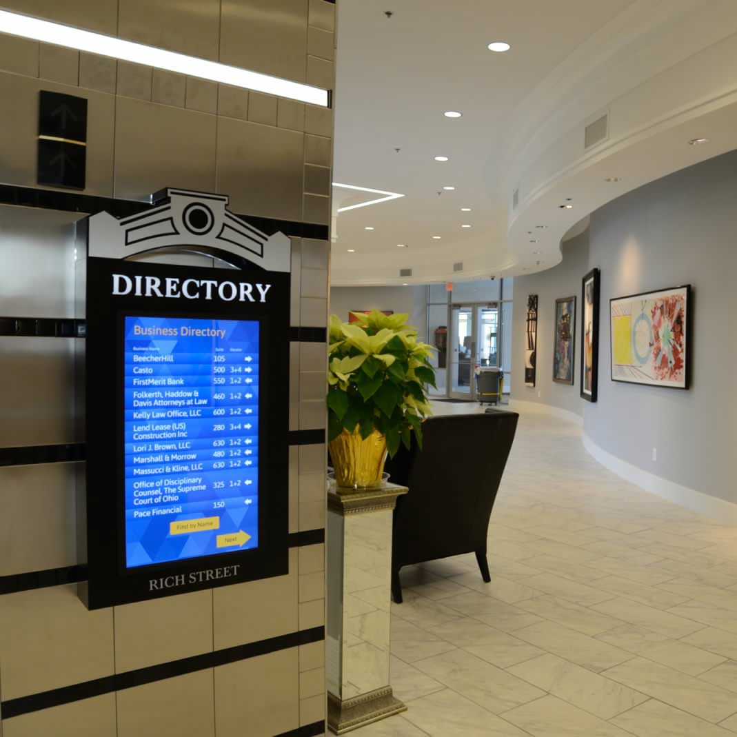 DETAILS: Tridico Sign Company asked DRM to program some kiosk directories for their client. We created a system where visitors can look up business names or professional names and get directions to their offices. We also made it easily updatable as building occupants come and go.