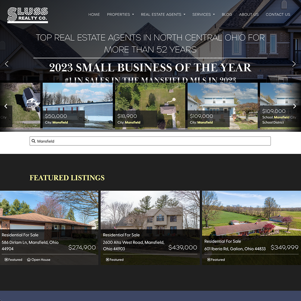 DETAILS: Sluss Realty wanted to add an online search option to their website. Sometimes searching for property listings online can be confusing, but through our programming we were able to provide Sluss with the quickest, most straightforward online search possible. With the simple search of a town or city, every listing that falls within that city and/or school district will immediately show. Additionally, site users can search for street names and other specifics to find the exact property they are looking for. This search also allows for imagery that makes the process of managing and searching for properties simple. We also worked with Sluss to program an internal web application that tracks sales and volume for their agents.