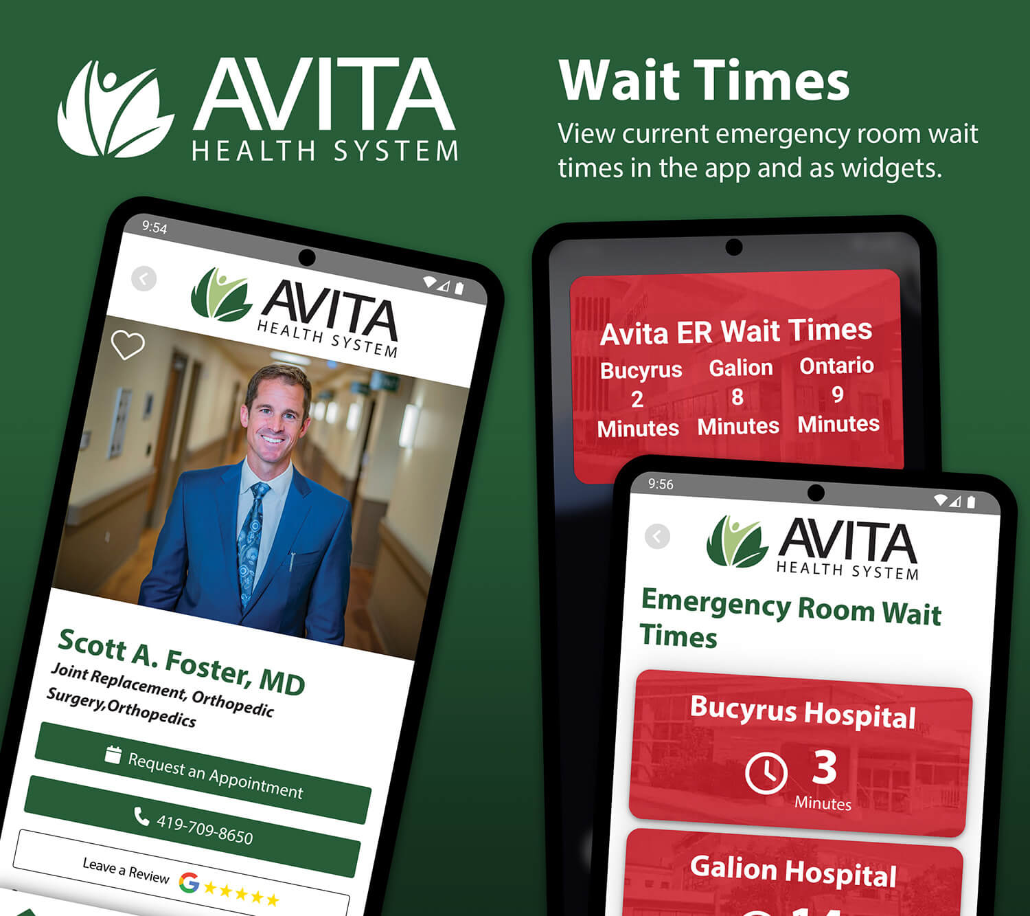 DETAILS: Avita provides a wide range of healthcare services across multiple physical locations. DRM worked with Avita to expand their reach with a mobile app. This app, available on both the Apple App Store and Google Play, provides real-time updates on ER wait times, helps you find and favorite your providers, and lets you easily request appointments.