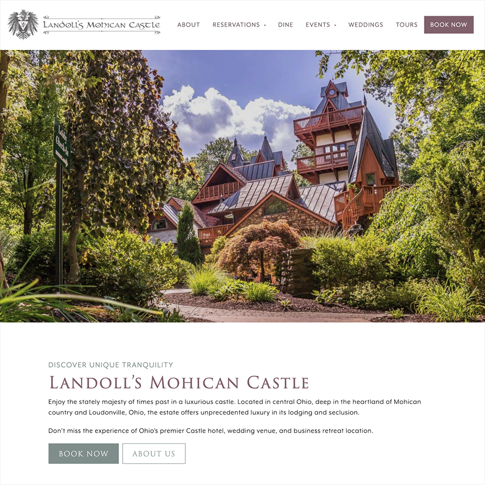 DETAILS: Landoll’s Mohican Castle, a majestic hotel and wedding venue, needed a sophisticated website to match their grand location and architecture. We designed their site with a heavily photographic focus to showcase the beauty of the castle and grounds. Subtle transitions on the pictures as visitors scroll and hover add interest, and the responsive design allows visitors to see the grandeur of the castle on whatever device they use.